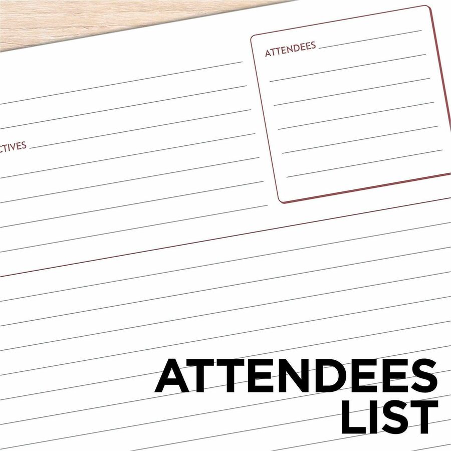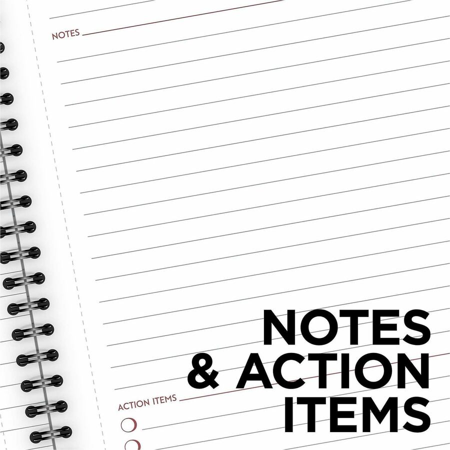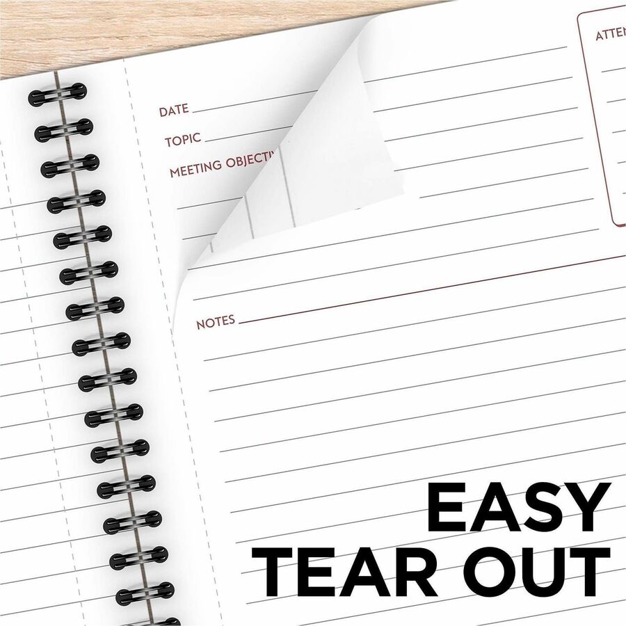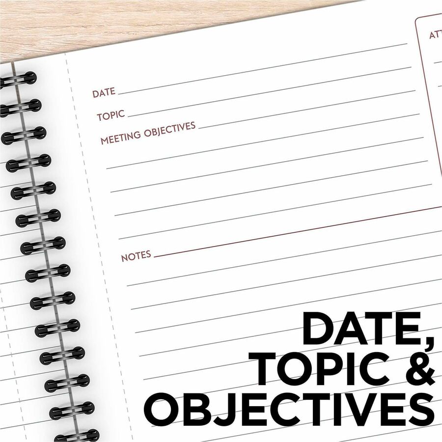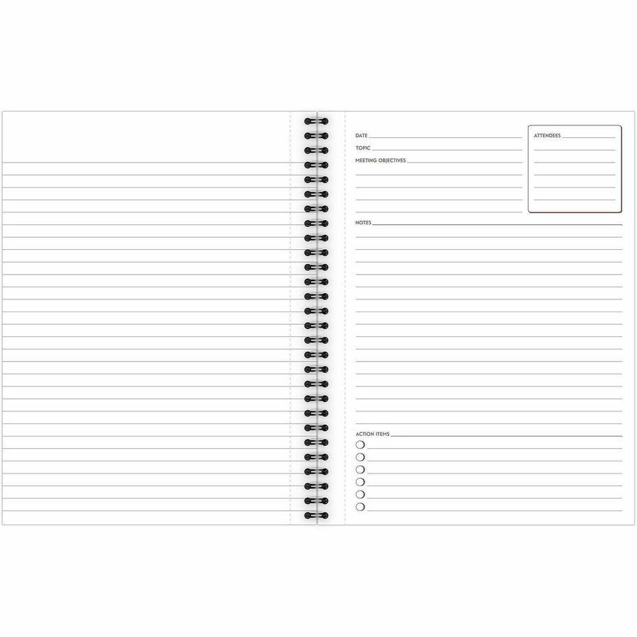 | Marketing Information | Professionally styled business notebook features unique note-taking areas to efficiently organize all of your meeting notes and action items. Each undated page is formatted specifically for meetings with sections to list attendees, objectives and more. Action list at the bottom contains checkboxes to easily keep track of your follow-up tasks. Wirebound covers are paper-based with a linen material finish to create a professional appeal. Premium, double-sided pages are perforated for quick removal. |